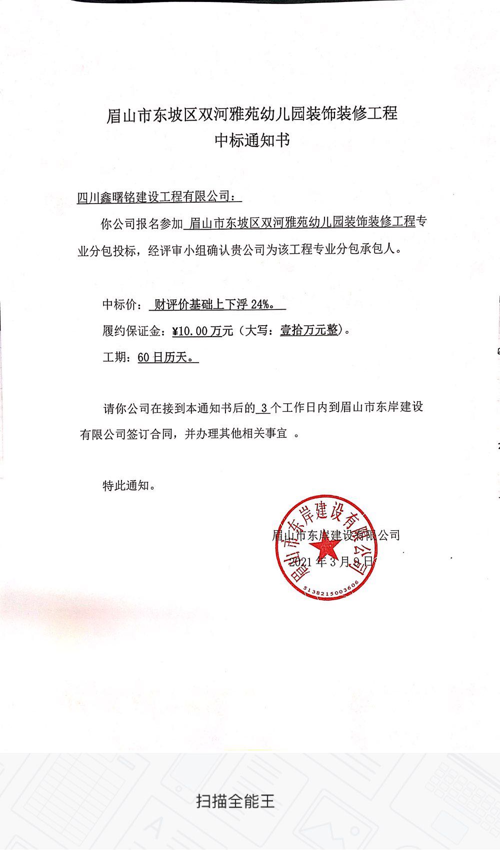眉山市東坡區(qū)雙河雅苑幼兒園裝飾裝修工程中標(biāo)公示